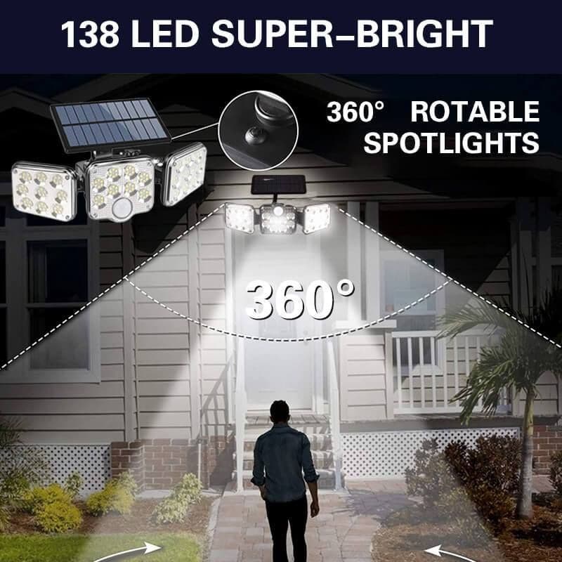 Deze buitenwandlamp op zonne-energie heeft 3 koppen met 122 LEDS die 360° kunnen worden gedraaid voor een goede lichtdekking en u kunt de koppen gemakkelijk richten in de richting die u wilt.
